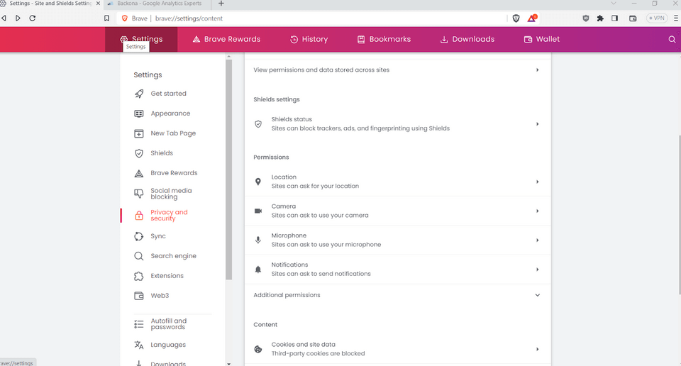 - Privacy settings: Opera allows a high degree of customisation in its privacy settings. It includes the option to block third-party cookies, manage security protocols, and control site settings including camera and location access.