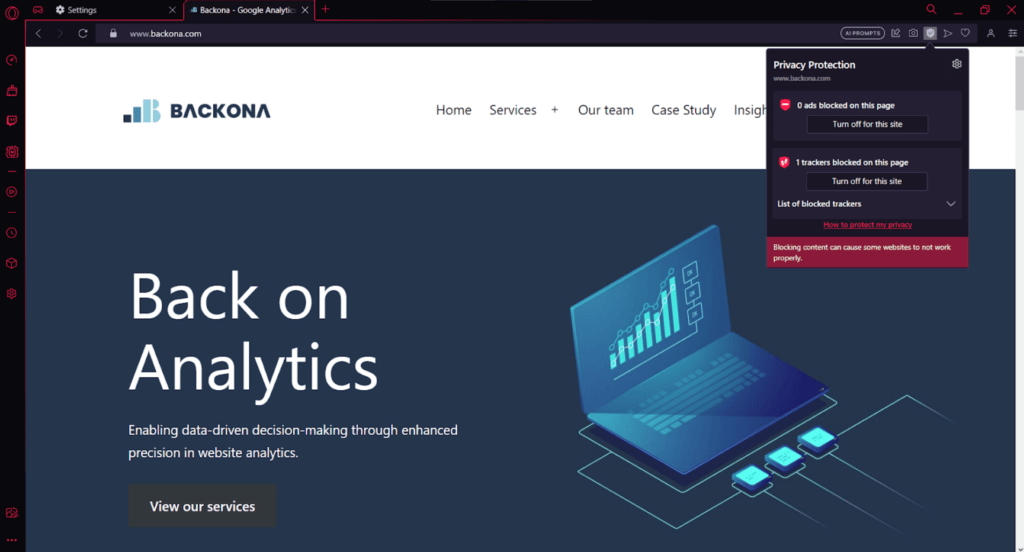 Brave - a browser for crypto fans and privacy enthusiasts based on Chromium. In the case of standard settings, analytic scripts are blocked at the uBlock tool level (chrome plugin) without the need for its installation. By default, the browser blocks Google Tag Manager. For sites using this solution, it means that tags implemented through this solution (e.g., GA4, Facebook Pixel, Linkedin Insights Tag) will not be launched at all. The same situation applies to Google Tag Manager Server Side, which uses the GA4 script to send data (a very common configuration) - it is also blocked despite using the site's subdomain to send data. Very aggressive filtering already in basic settings.