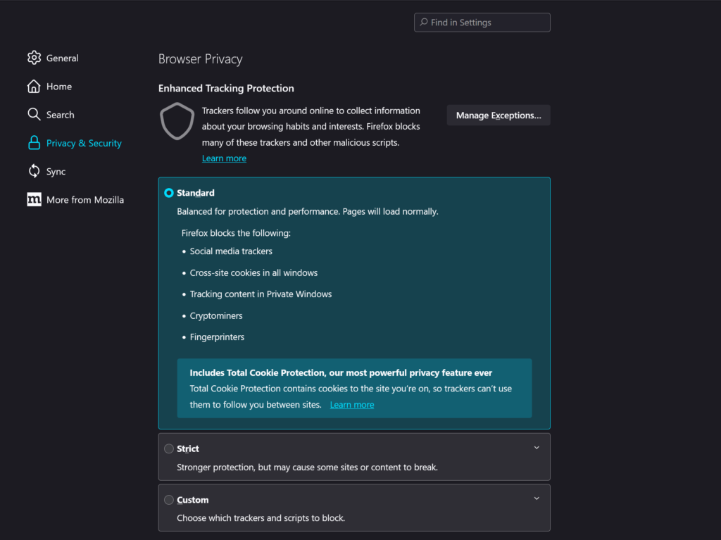 - Enhanced Tracking Protection (ETP): This feature provides a triad of protection levels (Standard, Strict, and Custom) to opt from, thereby enabling users to strike a balance between privacy and website compatibility. ETP functions by obstructing known trackers, third-party tracking cookies, and cryptominers.