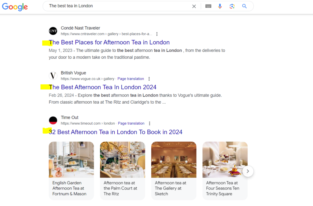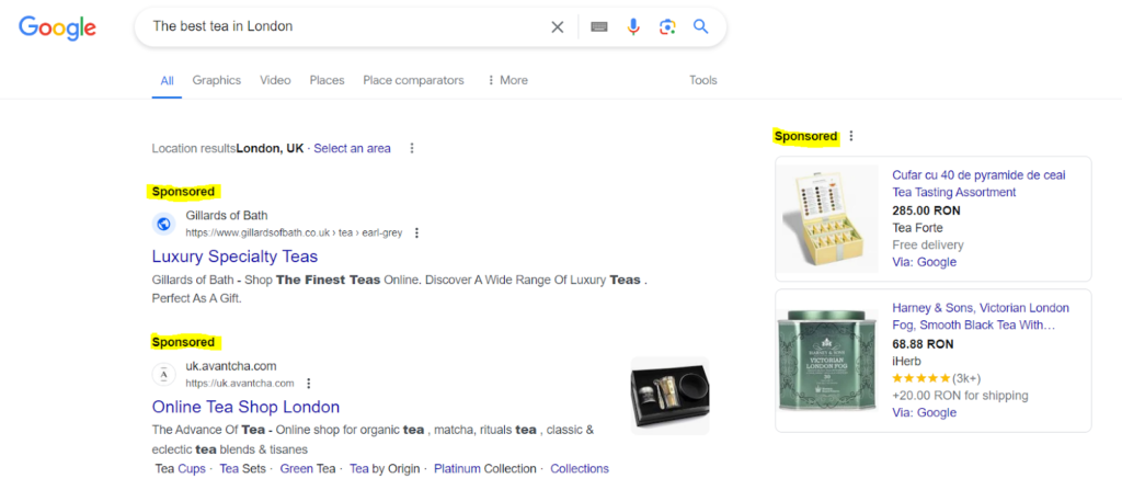 Below you can see an example for the sponsored results for the keyword “The best tea in London”.