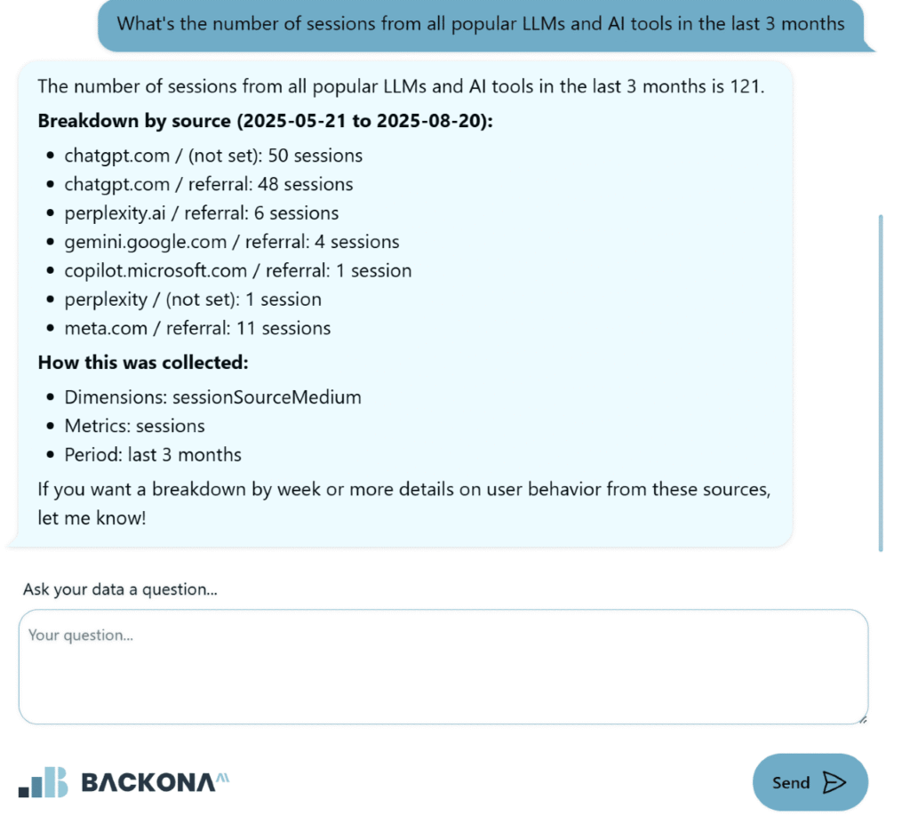 You can check AI traffic in Backona AI or Google Analytics, but it’s still not the full picture.